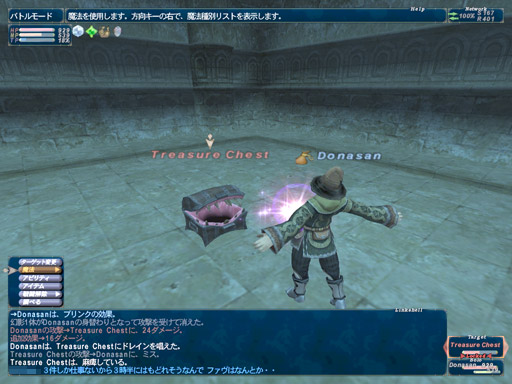 | ↑どうやら、トカゲやヴァーミンを倒すと良いと聞いたので、ポコポコ倒してみますが出ません。 トカゲさんを倒したところ、「ソ・ジヤの箱のカギ」をDROP。箱開けに箱探しのたびへ。。。 運良く「Tresure Chest」を発見、トレードしようとすると・・・ ミミックでしたヽ(`Д´)ノ ナンジャコリャー!しかも強ぇぇぇえええ! 間隔が早く、ブリスキが追いつかない事もしばしば、スタンWSや毒WSもあるので しにそうになりつつやっとこ倒しました。これでLv60のMOBとは思えない強さですね。 後に調べると、ミミックもチップを落とすらしいのですが・・・何も出ませんでした。 楽以上が出しやすいよ~。と言われたのですが、ここは楽以下のMOBしか居ません。 そこで、赤(Lv60)に変更する事にしました。 |