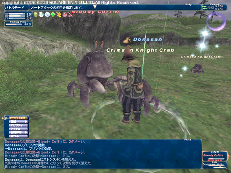 | 一昨日だったか、海岸を散歩していたら???を発見。 何かなと思いつつ、チェックしてみると【嫌な気配がした】との表示が(?_?) いきなり後ろからどつかれて振り向けばぁ♪ ↑こんなカニがいました。 聞いてないよぅ。取り合えず、寝→精霊→寝を繰り返してみた所 最初は上手く寝るのですが、耐性がつくらしくジリビンに・・・ しょうがないので町に戻って、サポ赤にしてガチで行く作戦に切り替えました。 |